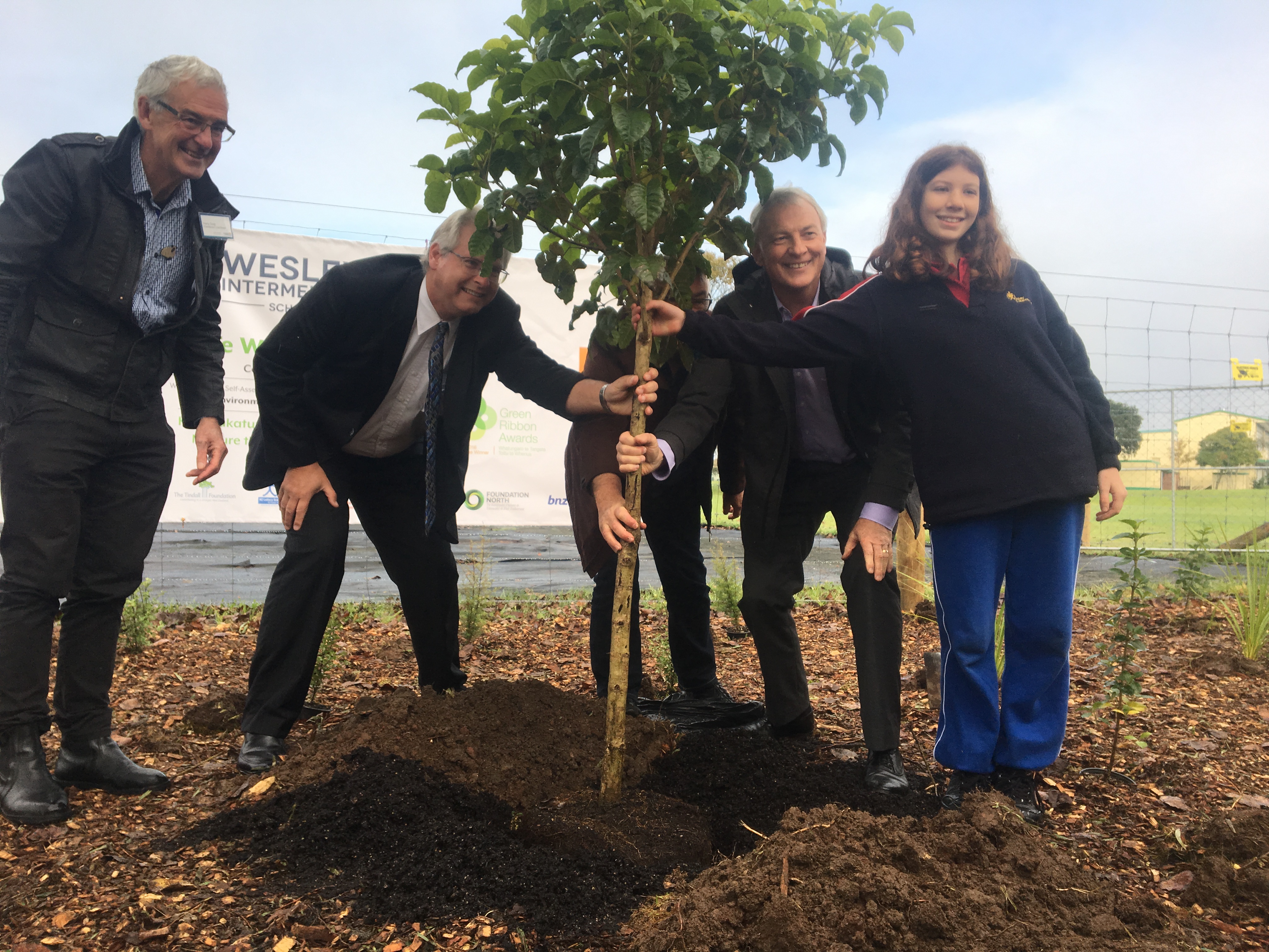Mayor Phil Goff was joined by representatives from the Department of Corrections, Trees that Count, Te Whangai Trust, Wesley Intermediate School and the local community to plant trees in the Oakley Creek catchment in Mt Roskill.
